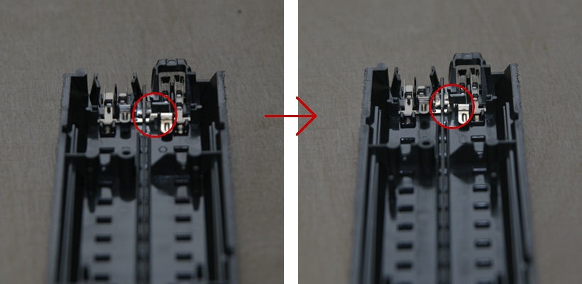 To implement traffic control, the system needs to be kept informed of the positions of the trains at all times. The primary method I'm using for this is track circuits. Märklin has their own special circuit tracks, but they are rather expensive and only available in one form. Fortunately, it's easy to modify any C-track piece to be used as part of a track circuit by cutting the metal conductor conneting the rails at both ends of the track (see pictures below). The modification is completely invisible from the topside of the track and does not prevent using the track for other purposes.