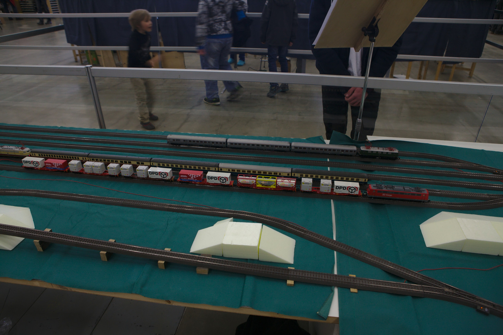 I was unexpectedly invited to the model railway christmas exhibition, an event I didn't even know about, because the originally planned main attraction could not come. Fine with me, I'm always happy to show my system to others. Since there was a lot of space to fill, the layout is somewhat different from my usual ones. Instead of the usual jumble of interconnected lines, it is just a single loop with two stations and a yard. In some ways this is more realistic, as real-world railways tend to be fairly linear, with the occasional junction here and there.