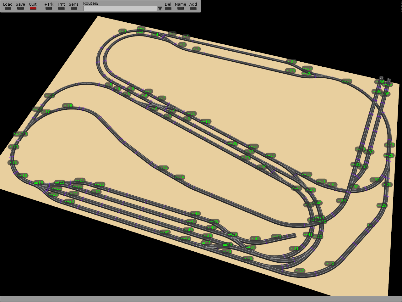 The designer allows planning a layout with an unlimited supply of tracks. Various tools like cloning entire sections of tracks and snapping them into free endpoints speed up building complex layouts. Grid-based heightmap terrain can be created, though tracks will just as happily hang aroudn in empty space. Turnout and sensor IDs of tracks can be indicated for operating the layout. Routes and zones can be defined for automatic operation.